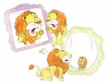 狮子走进屋子,在镜子前面一站,正好鼓起来的一面朝着他。他往镜子里一瞧,看见自己又矮又小,象只小老鼠。