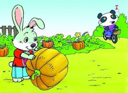小白兔马上就有了主意,它就连蹦带跳地到了以前它和一妈一一妈一种的那片南瓜地,摘了一个又大又黄的南瓜,它就想把南瓜运回家,可是小白兔用了九牛二虎之力也没能把这个南瓜搬起来,于是它就坐在地上想呀想呀,突然它看见了它的好朋友小刺猬正在向它家滚去,小白兔立刻想到一个好主意:小刺猬卷成一一团一,就能滚,那南瓜是圆的,它一定也能滚。小白兔叫住了小刺猬,它们俩一起把南瓜竖了起来,然后推着南瓜往小白兔家滚去。