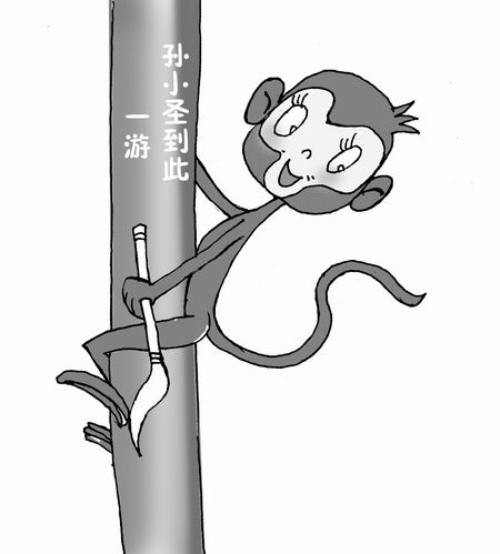 走着走着,它们看见了两根柱子,孙小圣就又淘气又骄傲地缠在两根柱子上,还掏出蜡笔,在柱子上写上了“孙小圣到此一游”七个大字。