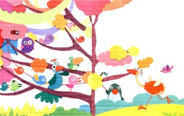 生日庆祝会开始了。孔雀跳起優美的舞蹈,鹦鹉给大家表演杂技,一群喜鹊飞上树梢,唱起动听的歌。接着,所有的鸟儿一起围着大个子鸵鸟,大声地唱起“生日歌”:“祝你生日快乐,祝你生日快乐,亲一爱一的鸵鸟!”
