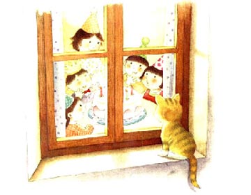 一天,野猫经过一幢小楼的窗口,里面传来拍手和唱歌的声音。他悄悄地朝窗户里偷看。一群人正围着一个小姑一娘一,等着她吹蜡烛。小姑一娘一撅一着小嘴,蜡烛的光一摇一摆,把她的脸照成粉一红色的,好漂亮啊!“祝你生日快乐!祝你生日快乐!”原来今天是小姑一娘一的生日!