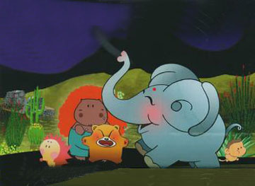 大象啊呜又来到了小刺猬扎扎家,把扎扎家的黑夜也全部吃了,扎扎也不哭了,跑出去,找到了小熊多多、小猴淘淘,在一起又跳又叫。