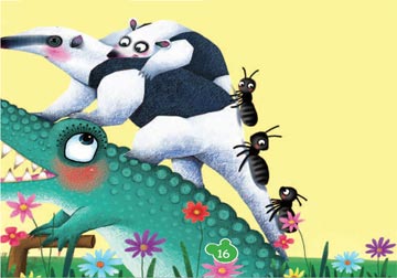 在大家努力“疊罗汉”的时候,小蚂蚁们则排着队一刻不停地向这个越来越高的“罗汉”顶端爬去。当食蚁兽爬到鳄鱼背上时,看见了一朵云,这朵云好像知道动物们的来意,始终飘浮在它们的头顶,替它们抵挡烈日。