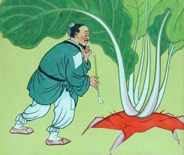 老爷爷说:“哎呀,萝卜长在底下怎么行呢?得让它晒太。”