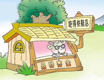 老鞋匠在乌龟镇开了一家新鞋店,鞋店的大门上立着一块闪闪发亮的招牌:跑得快鞋店。