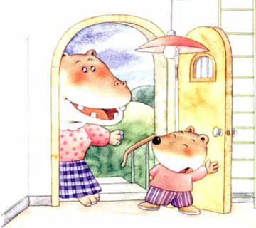河马先生惊讶地看了看太太,又看了看蛋糕,他微笑着闭上大嘴巴,坐了下来。