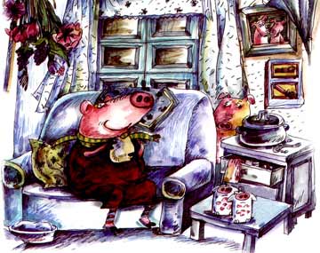 猪又把两个小猪放到火炉前,雪猪的脸上流下了很多水。猪说:“哟,这个小猪浑身湿透了!我用电吹风把他吹吹干。”