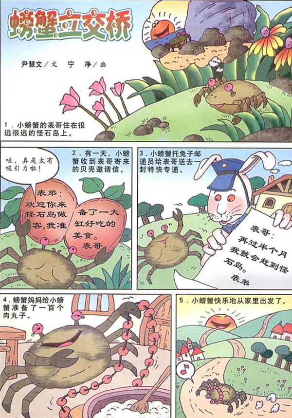 小螃蟹的表哥住在很远很远的怪石岛上。有一天,小螃蟹收到表哥寄来的贝壳邀请信。小螃蟹拖兔子邮递员给表格送去一封特快专递。....