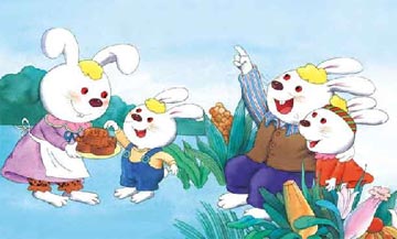 这时,兔一妈一妈一端出一盘点心。“月饼!月饼!”小兔一毛一毛一高兴地叫起来!