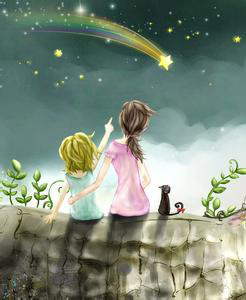 夜晚降临了,天上布满了一闪一闪的小星星。那么多,那么美,好像魔术师变出来的一大把宝石。有一天,我对天空许下了心愿,想给星星打一通电话,上天满足了我的心愿,眼前立即出现了一部通往天际的电话。